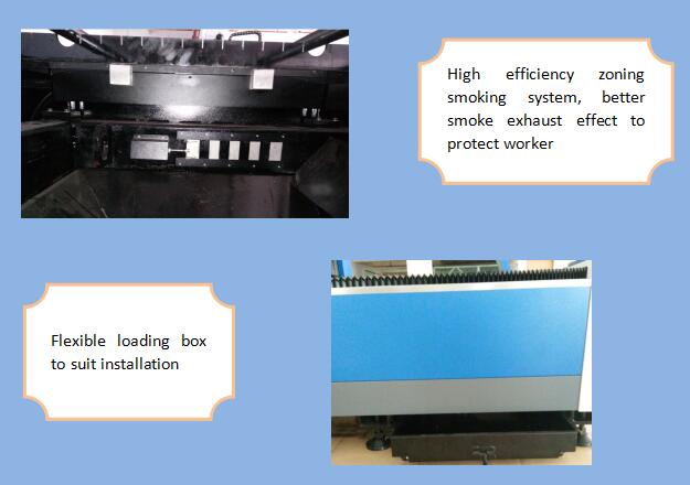 Machine. मशीन बॉडीच्या दोन्ही बाजूंनी उच्च कार्यक्षमता झोनिंग स्मोकिंग सिस्टम, मजबूत सेगमेंट धूळ आणि धूम्रपान संग्रह यामुळे कामगारांचे नुकसान कमी होईल.